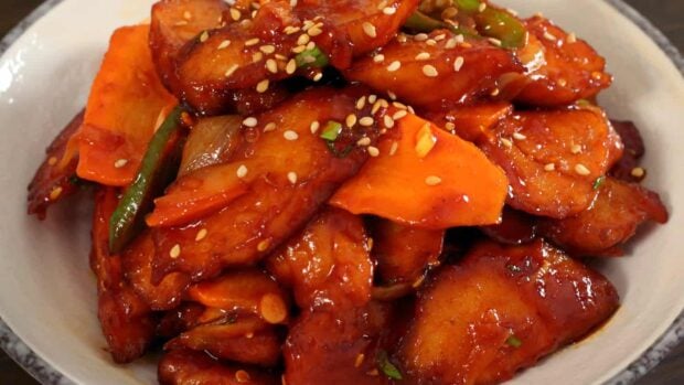 Dakgangjeong, extra crunchy on the outside, tender inside, and coated in a sticky, sweet-savory sauce.
